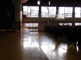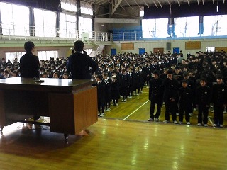 全校朝会、入場の合唱で2年生、頑張る!