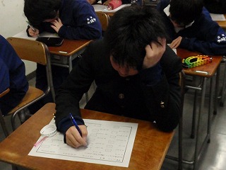 11日(木)に行われた数学計算問題の第5回学習コンクール。3年生も、真剣に取り組んでいましたが、時間が余っているようです。表情にも、余裕があり