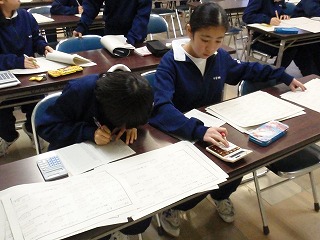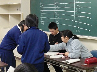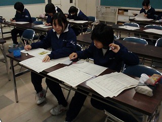 テスト終了後、第3会議室に学級の学習局員が集まって集計をしました。点数をつけながら、「やった〜!」「え〜!ダメだった」と、集計しながら歓声とため息が聞こえます。