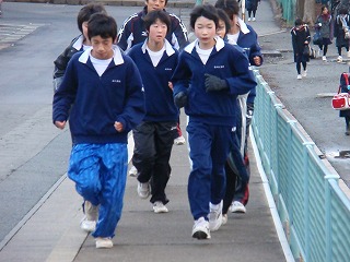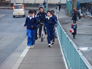12月12日(金)の朝のトレーニング。2年生の佐々木選手は、いつも通り校庭を同じペースで走っています。駅伝選手学校を離れロード練習に行きました。戻ってくるのを待っていて、やっと撮影できました。あと半月です。頑張れ!