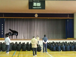 前日の12月9日の全校朝会でお披露目された「生徒会の旗」が体育館頭上に掲示されました。1年間私達の活動を見守ってくれます。成果の多い活動ができるよう、頑張ります!この目標に向かって、みんなで頑張ろう!高いところに掲示してくれた用務員さんに、感謝です!