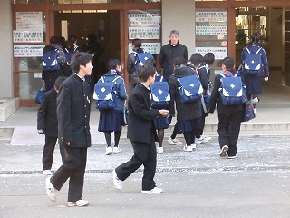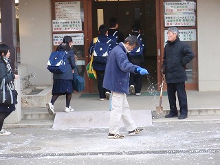 いよいよ2学期の最後の週です。校長先生は、登校してくる生徒達が滑らないように、昇降口入り口の氷割りをしながら生徒を迎えました。用務員さんは、融雪剤をまいてさらに滑らないようにしていました。