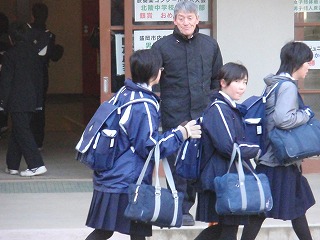 今日も寒いです!校長先生と1学年生徒会の男子が朝の挨拶を行っています。いよいよ2学期の最後の週になり、今日から三者面談がはじまります。2学期のまとめになるように頑張りましょう。冬休みの計画は立てて、担任の先生に見てもらいましたか?