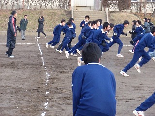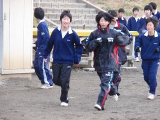 毎日寒い朝が続いています。カメラを持って、7時30分過ぎ校庭へ向かう毎日です。撮影していくうちに、手が痛くなってくるぐらいの寒さです。しかし、生徒達の中にはハーフパンツでランニングし、トレーニングに参加している生徒も見られます。2年生の男子2人。黙々と参加しています。手袋を準備して練習に参加しましょう。