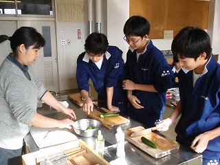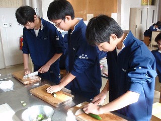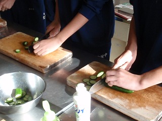 男子の生徒が「キュウリの輪切り」のテストをしていました。「なんか危なそ〜な」手つきできゅうりを切っていました。先生が、そばで評価していました。すみませんでした!このキュウリを食べてしまいました。「先生、このキュウリ洗っていないよ!」と言われました。すみませんでした!