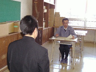 12月17日(水)の三者面談時間に、3年生の面接練習指導がはじまりました。今まで担任の先生の指導を受け「自己アピールカード」や「面接の受け答え」を練習してきましたが、本番を想定しての練習です。