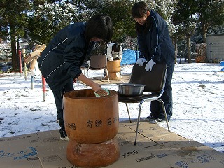 12月7日(日)に、城北集会所児童公園で「みたけ三丁目の餅つき大会」が行われました。この行事は毎年行われていますが、「餅をついたり、テント設営の準備をしたりと事前の準備が大変なので、力のある中学生にぜひ手伝ってもらいたい。」という地域からの要請があり本校中学生がボランティアとして参加しました。