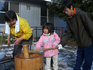 男子は、餅つきの返しを初めてとは思えないほど上手にやってくれました。本当にのみ込みが早く、器用なので驚きました。ついた餅は、地域の人と一緒にいただきました。ご苦労様でした。