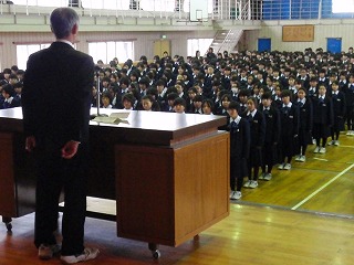 12月22日(月)2学期の終業式が行われました。校長先生から「2学期の生活や行事を振りながら、2学期は「自分の良さを見つけよう」ということで取り組んできたこと、1,2年生はこの冬の間の部活動(4年ぶりの大船渡駅伝競走大会参加など)を頑張ってほしいこと、学習面では2,3年生は前年よりも学習成果が現れていること、さらにボランティア活動の充実をあげ、ひとり一人自分ができる小さな奉仕活動に取り組んで欲しいことなど」の話をされました。最後に、「事故や事件に遭わないように冬休みを過ごしましょう」と締めくくりました。