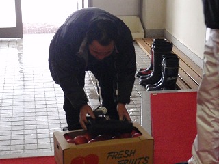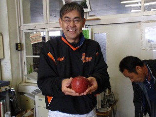 12月22日(月)2年生が5月の宿泊研修で「職業体験学習」として、2年3組と4組が太田地区の山口さんの指導のもと「リンゴの花の摘花」作業を体験しました。(この様子はHPでも紹介しました。)その「摘花して実際に実ったリンゴ」を「子どもたちの食べさせてください」と持ってきていただきました。とっても大きくて、キラキラ光っているリンゴ(フジ)でした。
