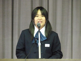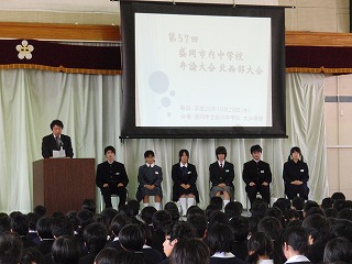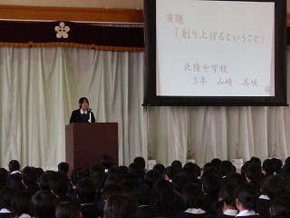 市中弁論大会に出場することが決まって、本当に短い時間の中で原稿を作成し、練習を重ねて当日を迎えた、市中弁論盛岡北西部大会。10月29日に厨川中学校の生徒を前にこの大会が行われました。北陵中学校の代表として、3年生の山崎さんが出場しました。「創り上げるということ」と題して「市中陸上の応援をつくりあげるまでの苦労や出来上がったときの感激を自分の体験を通して感じてきたことやみんなに訴えたいこと」を発表しました。夏休み中朝早く学校にきて応援を作っている様子、初めて全校の前での練習会で恥ずかしそうに踊った様子や市中陸上当日笑顔で踊り叫んでいる場面を思い出しました。自分も驚く、最優秀賞を獲得しました。