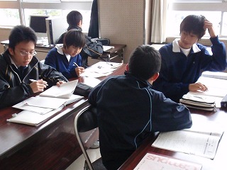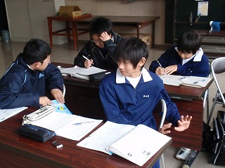 12月25日(木)第1会議室に明かりがついている、と思って中にはいると男子バドミントン部の5人が勉強中でした。「部活動を待っている間に宿題をしています。」ということでした。学習用具持参で部活動に来ているのがすごい!