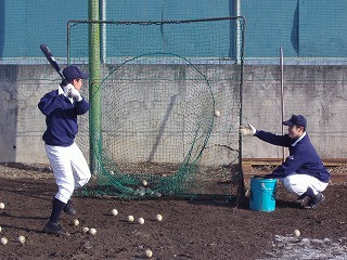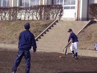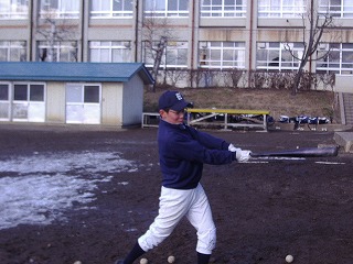 校庭が雪で使えないこの時期ですが、今年の雪は少なくグランドの土が見えます。その場所を使って練習している野球部を撮影しました。トスバッティングくらいしかできませんが、土が見えて打てるだけいいのではないでしょうか。