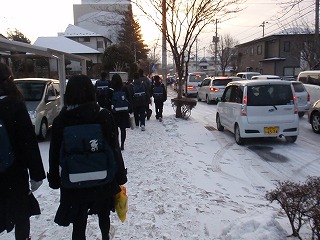 7時20分頃の中央高校前の様子です。受験生を送りに来た車で、とても混んでいます。車での移動は極力避け、徒歩が一番です。
