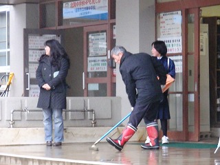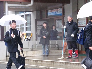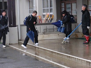 小寒から大寒への、この1月下旬。雪が降るのではなく、雨の朝です。寒さが感じられない朝の登校の様子です。今日は、1,2年生は実力テスト。冬休み中の学習の成果を確かめよう。3年生も今日は、スコーレ高校と江南義塾高校校の一般入試があります。頑張れ!3年生。