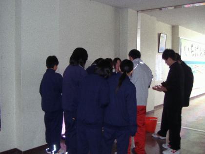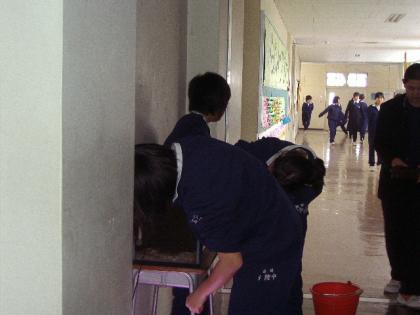昼休みの時間を利用して、2年生女子のソフトボール部員と有志数名が、廊下の水槽掃除を行いました。生徒たちは、先生に言われてやるのではなく、自ら進んで取り組みました。