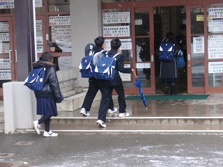 今日27日の登校時生徒を迎える先生が少なく、静かな登校風景です。朝のトレーニングの指導をしている先生は体育館です。昇降口前の雪を掃きながら、出勤してきた渡辺先生にあいさつ取り組みをしてもらいました。今日も校長先生は山形県にいます。明日遅く帰ってきますので、明後日からはいつも通りの校長先生の挨拶が行われると思います。