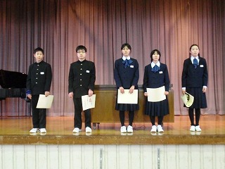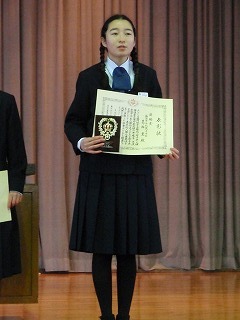 盛岡地方法務局・岩手県人権委員連合会主催の全国中学生人権作文コンテスト岩手県大会で、3年生の葛西さんが奨励賞を受賞しました。「自分で全校朝会の中で報告します。」と決意しての発表でした。とっても大きな声で発表しました。