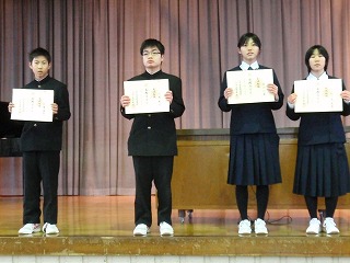 さらに日頃の鍛錬の成果です。剣道部の4人が剣道初段を取得しました。高山さん、佐々木さん、千葉くん、佐藤くんです。「次は2段を目指します。」と目標を発表しました。