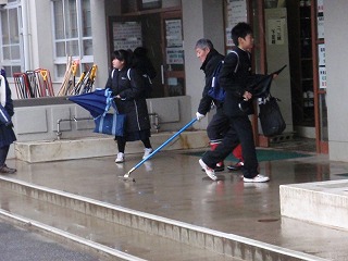 ※写真3は、生徒昇降口で生徒に挨拶をしている様子です。挨拶する前には昇降口前も掃除をしています。(7時30分頃の様子です。)