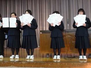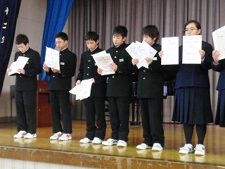 水泳部の皆さんが先週湯田町で行われた「岩手県ABC級水泳競技大会」の賞状を披露してくれました。一人で4枚も賞状を持って顔が見えません。1位が11種目、2位が5種目、3位が5種目ありました。水泳部の今年の活躍を期待します☆