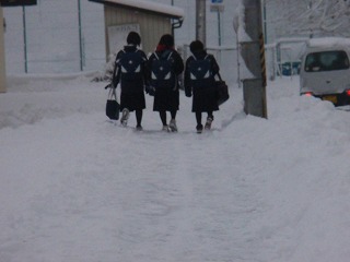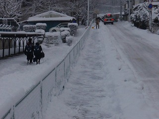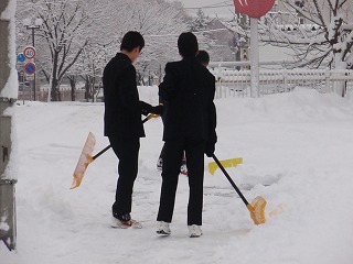昨夜から降った雪で一面銀世界に戻ってしまいました。ラポム前までの通学路を確保するのも大変です。登校してくる生徒たちの足がいくらかでも濡れないようにと雪かきです。こうやって生徒たちの手で通学路を確保しています。誰かがやってくれているんだという感謝の気持ちが必要ですね。