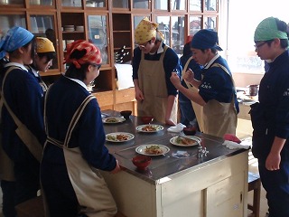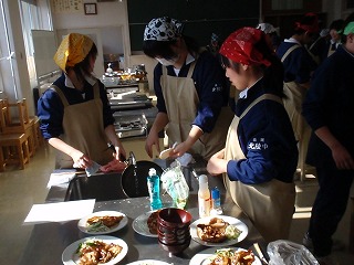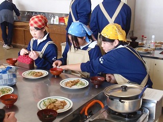 2月5日(木)の4校時、2年4組の調理実習が行われていました。12時を過ぎていましたので、調理がほとんど終わりお弁当と一緒に試食の時間となっていました。
