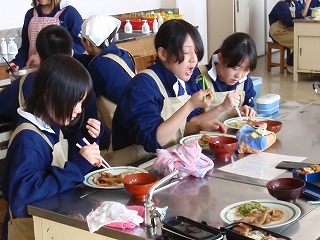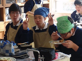 2月5日(木)の4校時、2年4組の調理実習が行われていました。みんないい表情でいただいていました。すべての班の写真を載せたいと表います。