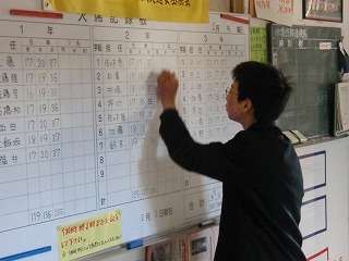 2年生の男子生徒が、職員室前の出席黒板を管理してくれています。毎朝黒板を丁寧に消して、今日の出欠席を学級ごとに記入できるようにしてくれています。この生徒は毎朝のトレーニングに参加してから消してくれています。毎日の活動に感謝しています。