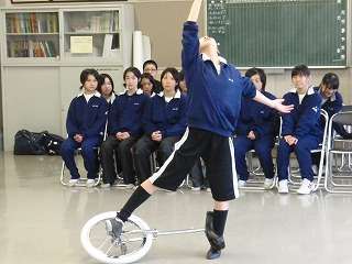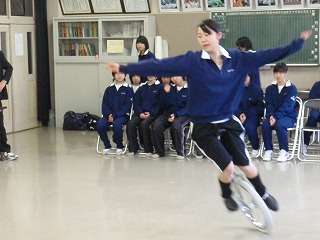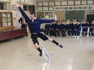 ※2月13日(金)「3年生を送る会」の有志参加のオーディションの様子です。坂井さん(一輪車)の発表の様子です。すばらしい妙技にビックリです!