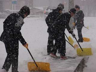 朝早くから雪かきをしましたが、かいてもかいても降り続く雪にうんざりです。早い生徒達は7時前から4人が福島先生と一緒に昇降口前で雪かきしていました。私も急いで雪かきです。ラポム前までの道をつけなければなりません。今日は一日大荒れの天気のようです。