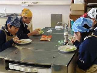 2月13日(金)の3校時、2年2組の調理実習が行われていました。できあがった「サケのソテー」と「サラダ」をおいしくいただいていました。おいしいものを自分たちで作り、食べているのですからみんないい表情です。ニコニコです!(^o^)