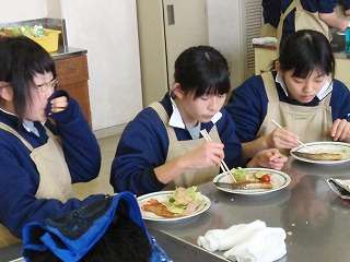 2月13日(金)の3校時、2年2組の調理実習が行われていました。メニューは「サケのソテー」と「サラダ」でした。できあがった「サケのソテー」と「サラダ」をおいしくいただいていました。