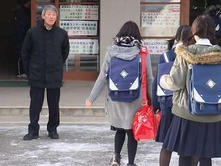 生徒昇降口前の坂は滑ります。転んでいる生徒がいますので気をつけてください。