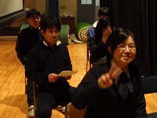 2月26日(木)の午後、「3年生を送る会」が行われました。3年の先生方は、ある日の3年生の教室風景の寸劇を行いました。な!な!なんと!北陵ジャージで出演する先生、男子制服で出演する先生、女子の制服で出演する先生と衣装も凝っていました。後ろから見たとき「中学生ですか?」と思っていたら「なんと井上先生」でした。最後は宮澤先生のまさに元気100%の踊りと今野先生のくさい演技が場内を沸かしました。
