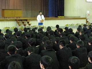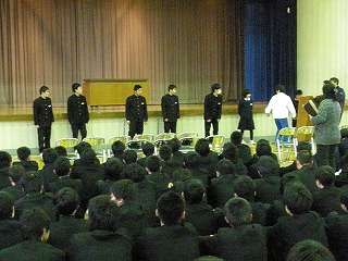 毎週金曜日は3年生のショート集会です。3月6日(金)が、最後の3年生のショート集会でした。この日は私が生徒の前に立つことができましたので、「皆勤賞の生徒の確認」と「呼名の返事」の話をしました。(高校の卒業式で大きな声で呼名の返事をしていました。担任の先生が心を込めて皆さんの名前を呼びますから、大きな声で返事をしてほしい。呼名した担任の先生や校長先生はもちろんですが卒業式に来てくれた父さん、母さんに聞こえるぐらいの大きな声で返事してほしいと)また、昨日5日(木)の放課後受検のない生徒達が「1階のトイレを掃除してくれました。床や便器はもちろんのこと、換気扇まで取り外しての掃除でした。感謝しています。あと1週間です。お世話になった校舎に感謝に気持ちを込めて生活してほしいと思います。」と話をしました。がんばれ!3年生。