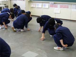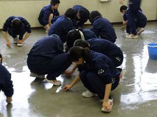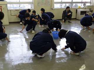3月6日(金)の午後、一斉に教室の床磨きを行いました。1年間お世話になった教室です。毎日毎日担任の先生や美化局の生徒達が、教室の整理整頓をしてきました。今日の床磨き、そして12日(木)のワックス塗りでまた教室が綺麗になってくれれば、新しい学年の人たちも心地よく使えるはずです。今回は2年生の様子を掲載しました。