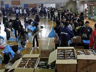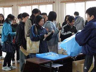 テストを受けた後、体育館で内ズックを買いました。自分ではいて見て、大きさを確認していました。交換してもらっている生徒もいました。新しいズックを履いて気持ちもウキウキです。