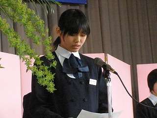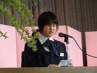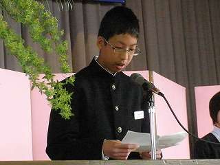 平成21年度の1学期始業式が行われました。2年生の三浦さん、3年生の細畑くん、生徒会の高山さんが今年度の決意を発表しました。三浦さんは「2年生には我慢する力が必要です。集会で我慢して立っていることやしゃべらないことなど、2年生として頑張らなければならないことがあります」と。細畑くんは「2年生のスローガンである、和、輪、話を大事にして、いつも心に大魔神をもって生活や学習をします」と話をしました。生徒会からは、「2年生は学習コンクール一発合格や部活動での先輩としての行動を、3年生は大会に向けてあきらめずに頑張ってほしい」と話をしました。