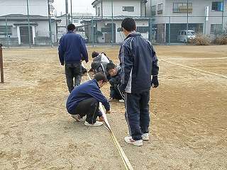 ※4月1日(水)コート整備、ライン作りをしているテニス部員の様子です。