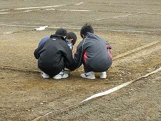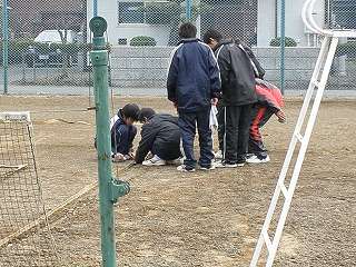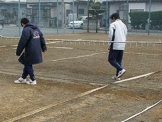 外での活動期間の少ないテニス部が外でコート整備を始めました。冬の間、なかなかボールを打てなくて体力作りばかりでしたが、ようやくコート整備が始まり練習開始の準備を行っていました。「早くボールを打ちたい」そんな気持ちでコート整備をしていました。