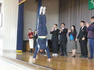 佐々木先生の「体操部へ入部してください。一から指導します。と言って「見事な倒立」を見せてくれました。生徒からも大きな拍手をもらっていました。