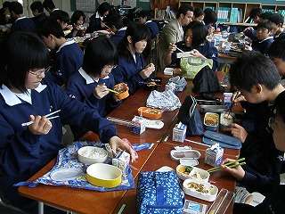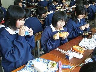 せっかく取材に行きましたので、1年6組の昼食の様子をUPします。楽しそうに昼食を取っています。
