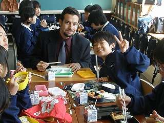 新しいALT(英語指導助手)のダニエル・ホワイトマンさんが1年2組で昼食!