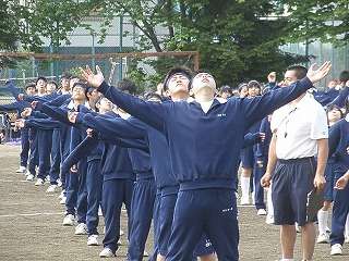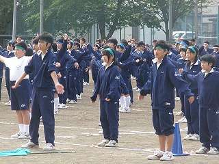 ※13日(水)に行われた「体育祭総練習」の様子です。ラジオ体操の様子です。