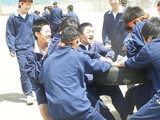 ※13日(水)に行われた「体育祭総練習」男子廃品回収の様子です。