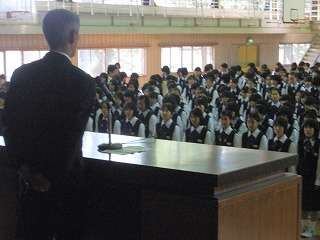 ※6月9日(火)の全校朝会で校長先生の話を聞く様子です。