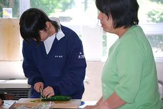 6月16日(火)久しぶりに調理室から楽しそうな声が聞こえます。覗いてみると、先生の前でキュウリの輪切りの練習?(いや、制限時間内にどれだけ切れるのかをやっていましたから、テストなのでしょうか?)をしていました。なにやら楽しそうです。