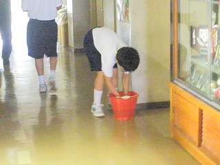 8日(水)管理棟の2階で剣道部男子が雑巾がけを行っています。「どうしたの?」と聞いても「返事が返ってきません」。理由はともかく、自分たちで決めて取り組んでいることですから、大変助かっています。階段も廊下も綺麗です。