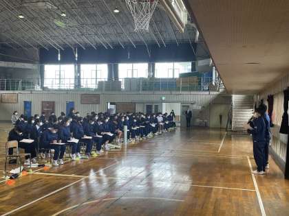 実際に体験したことや、その中で考えたことなどを模造紙にまとめるとともに、わかりやすい言葉で学年に伝えていました。聞いている生徒たちも、メモをとりながら真剣な表情で参加していました。